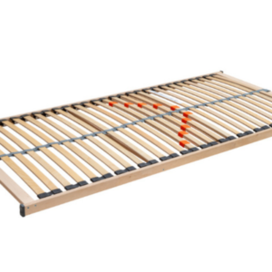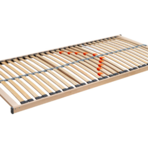 High-quality flat slatted base with 28 slats mounted in flexible rubber duocaps. Three anatomical zones and five reinforcements in the middle section allow individual firmness adjustment. Central strap increases stability and load capacity. Suitable for foam mattresses and sleeping on the back, side, or stomach.