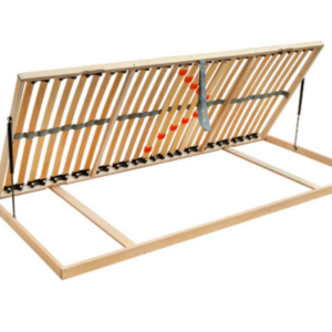 High-quality flat slatted base with 28 slats mounted in flexible rubber duocaps. Three anatomical zones and five reinforcements in the middle section allow individual firmness adjustment. Central strap increases stability and load capacity. Side lift with gas piston provides easy access to storage space. Suitable for foam mattresses and sleeping on the back, side, or stomach.