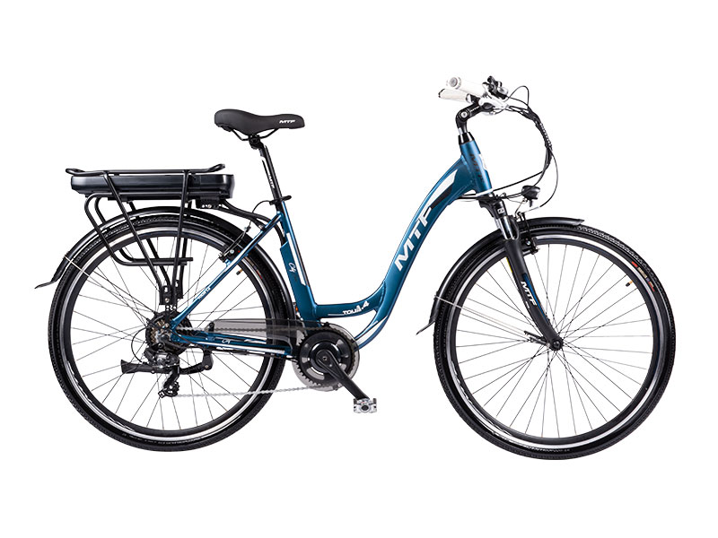 Urban e-bike with elegant design, rear hub motor, and an MTF battery with Samsung cells fully integrated into the frame. It has 26" wheels and comes in two frame sizes – 17" and 19". This model is suitable for both men and women of all ages, including shorter riders, thanks to the step-through frame that makes mounting easy.