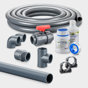 135,52 €Complete 50 mm piping kit for connecting the floor drain to the suction line. Consisting of: 1 x roll of SpaFlex hose 50 mm (12 m), 1 x 1.5 m PVC pipe 50 mm, 1 x 2-way ball valve 50 mm, 2 x 90° elbows 50 mm, 1 x T-piece 50 mm, 1 x adapter 2″ male thread x 50 mm, 2 x pipe clips, 1 x PVC cleaner, 1 x PVC adhesive, 1 x roll of Teflon tape
